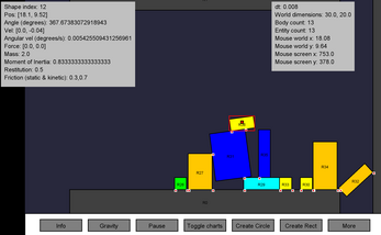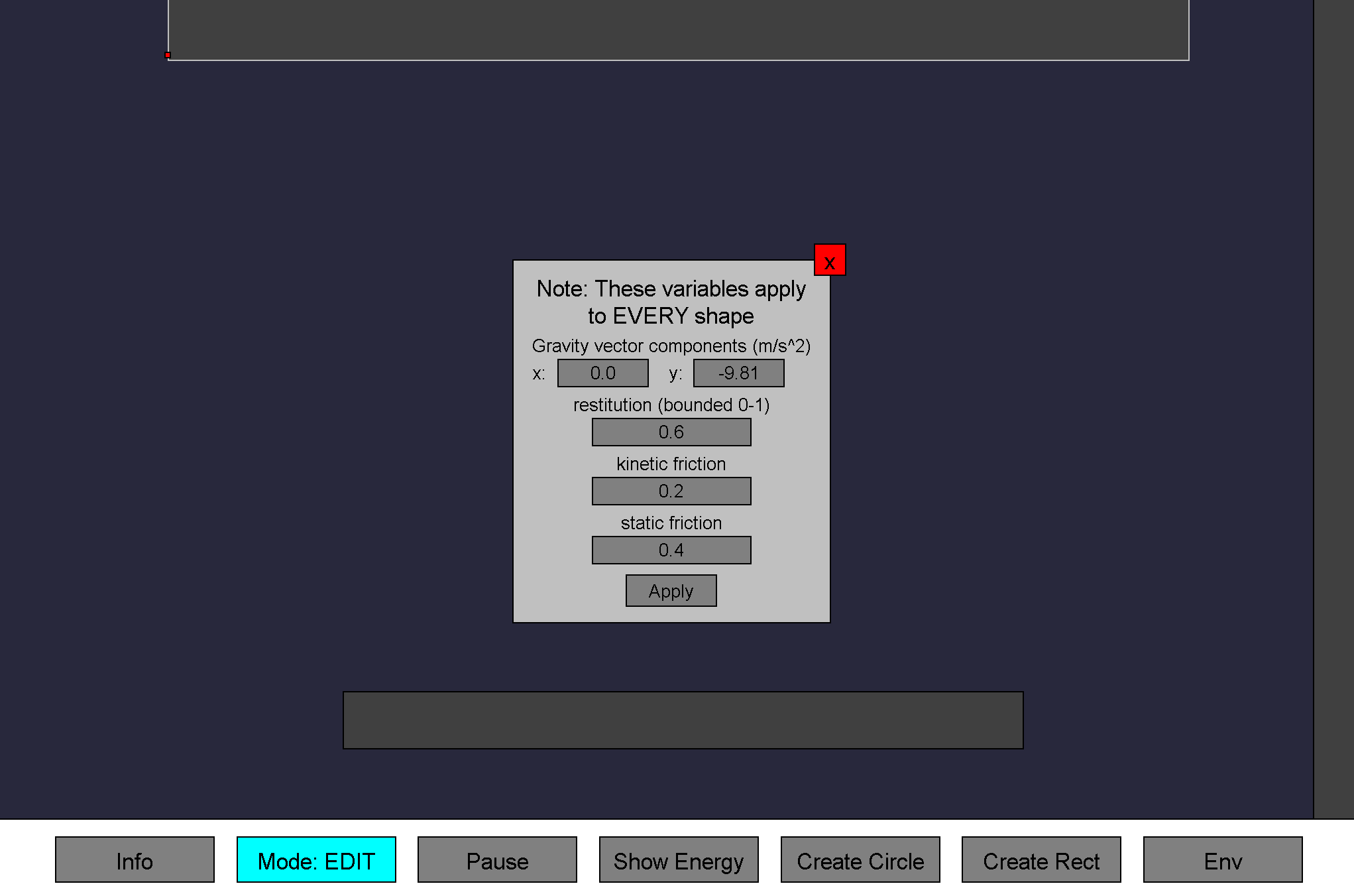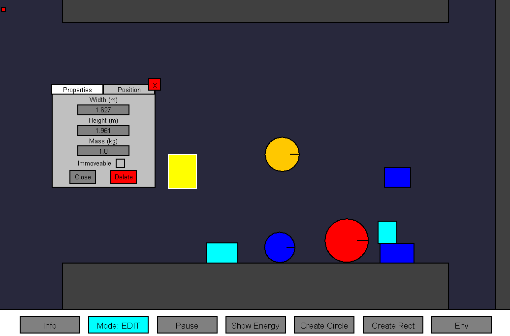 This is a 2d physics simulator I made by following a YouTuber called Two-Bit Coding. And I expanded on it a bit by adding UI elements and graphical data for my end of year physics presentation. Enjoy!